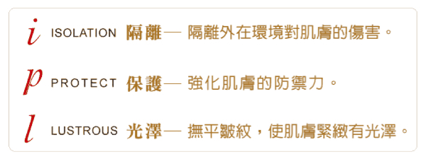 專利配方-【IPL-Defense】保養品,堅持以「品質」、「安全」、「專業」3高原則,並結合「隔離 ISOLATION」、「保護 PROTECT」、「光澤 LUSTROUS」的3大抗衡保護網,我們承諾只提供給妳,最適合肌膚的保養品,為妳打造自然的美肌。